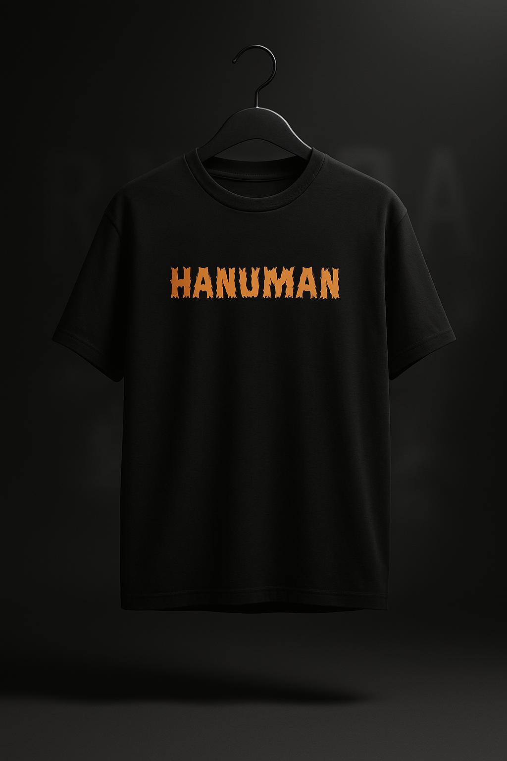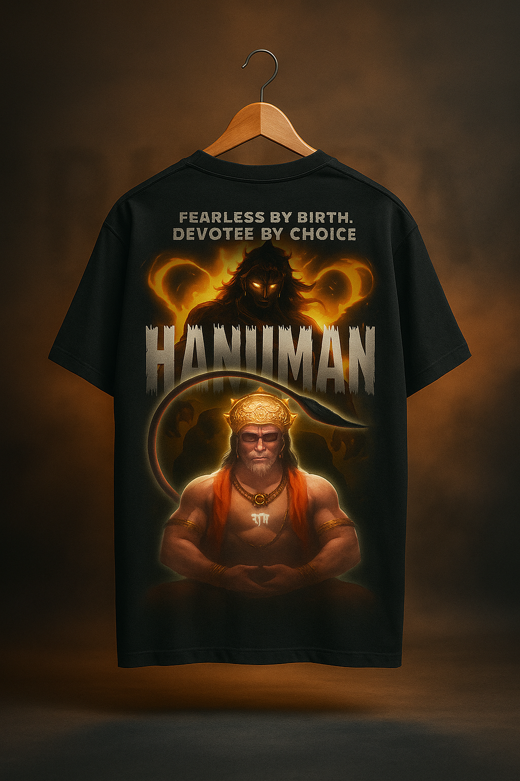 This premium oversized black t-shirt features a striking backprint of Hanuman, depicted with intense fiery hues and intricate detailing. Above him, the bold slogan “Fearless by Birth, Devotee by Choice” underscores the powerful artwork. The design is carefully scaled—wider and slightly shorter—to sit perfectly on the back, blending seamlessly with the fabric for a high-end, modern look that captures devotion and strength in one compelling visual.
